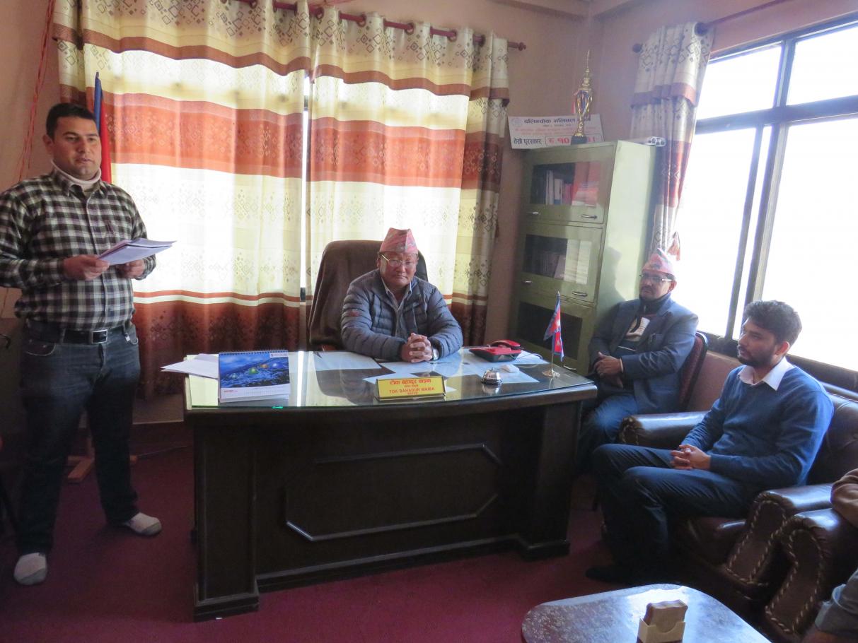 मिति: २०७७।२।१३ गतेका दिन यस नगरपालिकाको तर्फबाट नगर प्रमुख श्री टोक बहादुर वाइवा, नगर उप प्रमुख श्री निर्मला शाही, प्रमुख प्रशासकीय अधिकृत श्री प्रणराज न्यौपाने, नगर सल्लाकार श्री गोकुल गौतम, वडा अध्यक्षहरु, शिक्षा शाखा अधिकृत श्री लोकेन्द्र बहादुर विष्ट, सूचान तथा प्रविधि शाखा अधिकृत श्री उमेश अधिकारी, स्वास्थ्य शाखाका अधिकृत श्री दिपक कुमार घिमिरे, नेपाल रिसर्च एण्ड एजुकेसन नेटवर्कका अध्यक्ष श्री लोचन लाल अमात्य, कार्यकारी निर्देशक डा. राजन पराजुली , डा.