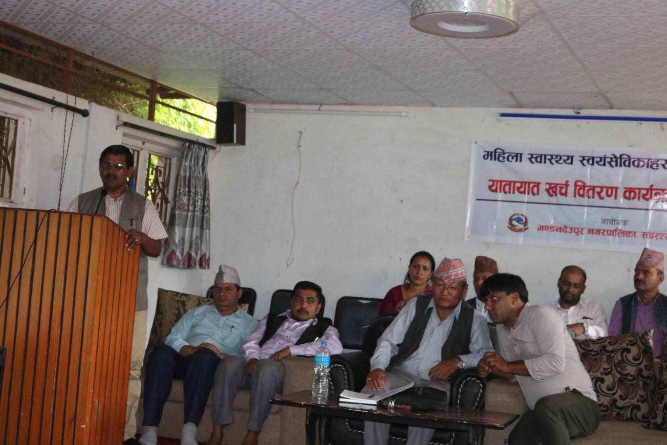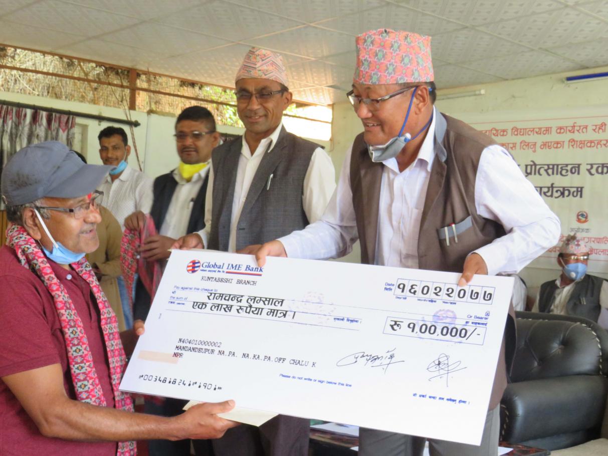 मण्डनदेउपुर नगरपालिकाको आयोजनामा मिति २०७८।०३।१५ गते ५० बर्ष नाघेका र अनिवार्य अवकास हुन १ बर्ष वाँकी रहेका स्वेच्छिक अवकासमा जान चाहने शिक्षकहरु तथा लाई रु १,00,000।– (एक लाख) प्रोत्सहान रकम वितरण सहित सम्मान कार्यक्रम नगर शिक्षा समितिका अध्यक्ष एवम् नगर प्रमुखको प्रमुख आथित्यतामा कार्यक्रम सम्पन्न गरियो। उक्त कार्यक्रमका केही